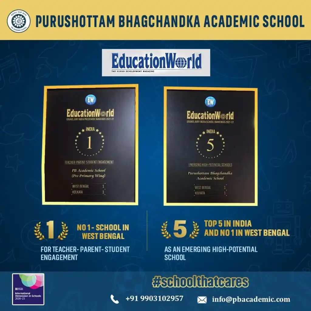 PB Academic School has won two awards from Education World, competing with schools all over India. It is No 1, in West Bengal for its “teacher-student-parent relationship”, and Top 5 in India as the “Emerging High Potential School”. We thank everyone for their continued support and belief in our school!