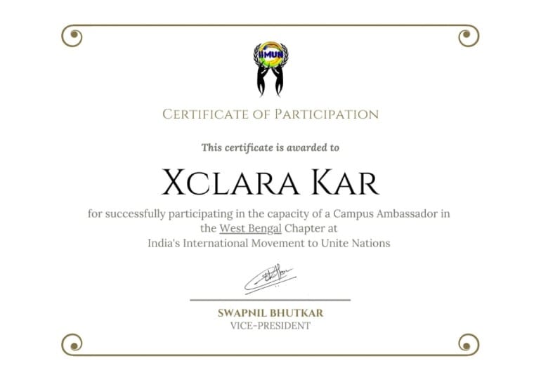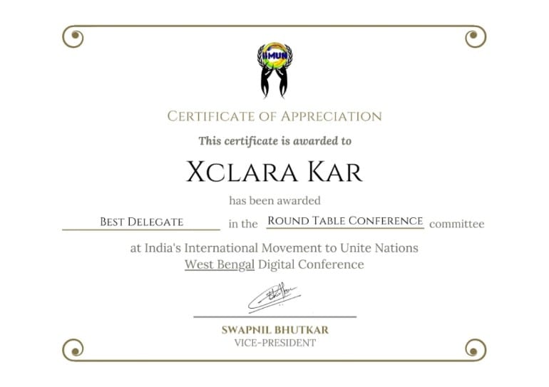 Purushottam Bhagchandka Academic School is once again proud of Xclara Kar for her Certificate of Participation and Certificate of Appreciation from IIMUN forum.