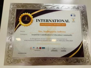 Our Principal Mrs Madhuparna Andrews has received International Excellence Awards for her contribution to Education Community. She has more than two decades of rich and varied experience in education and administration. The school is very proud of her well-deserved achievement!
