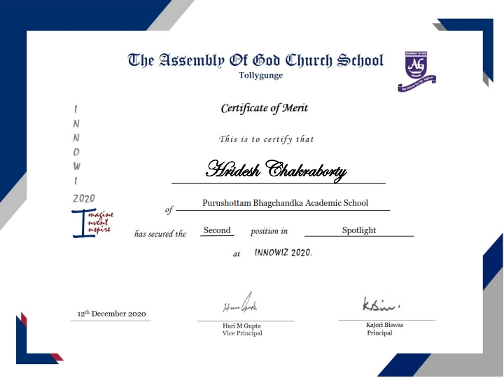 Purushottam Bhagchandka Academic School had participated in an interschool Science tech fest organized by AG Church, Tollygunge. There were specialized events based on Physics, Chemistry, Biology, Maths, Computer Science and some generalized events - both online and offline.