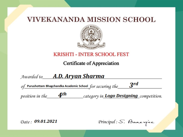 - A.D.Aryan Sharma, secured 3rd position, receiving Certificate of Appreciation in Logo Designing competition.