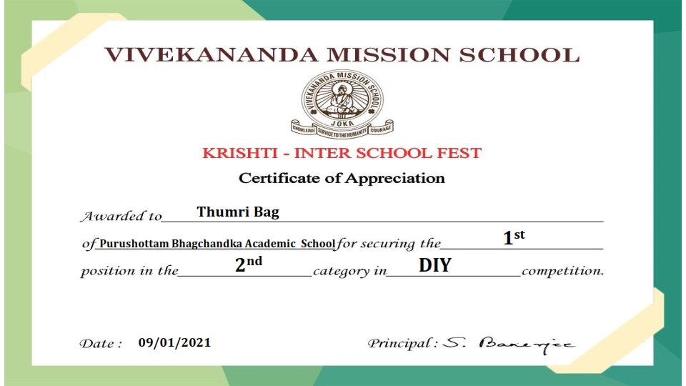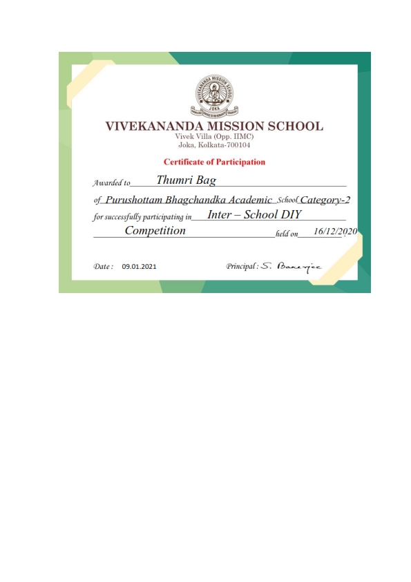 - Thumri Baag, successfully participated in Inter- School DIY competition, held on 16.12.2020, receiving Certificate of Participation.