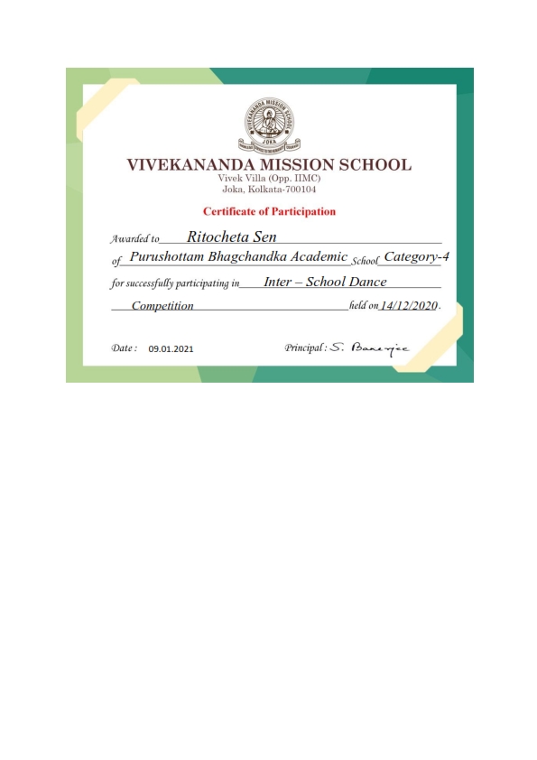 - Ritocheta Sen, successfully participated in Inter- School Dance Competition, held on 14.12.2020, receiving Certificate of Participation.