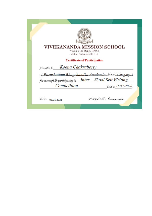 - Koena Chakraborty, successfully participated in Inter- School Skit Writing Competition, held on 15.12.2020, receiving Certificate of Participation.