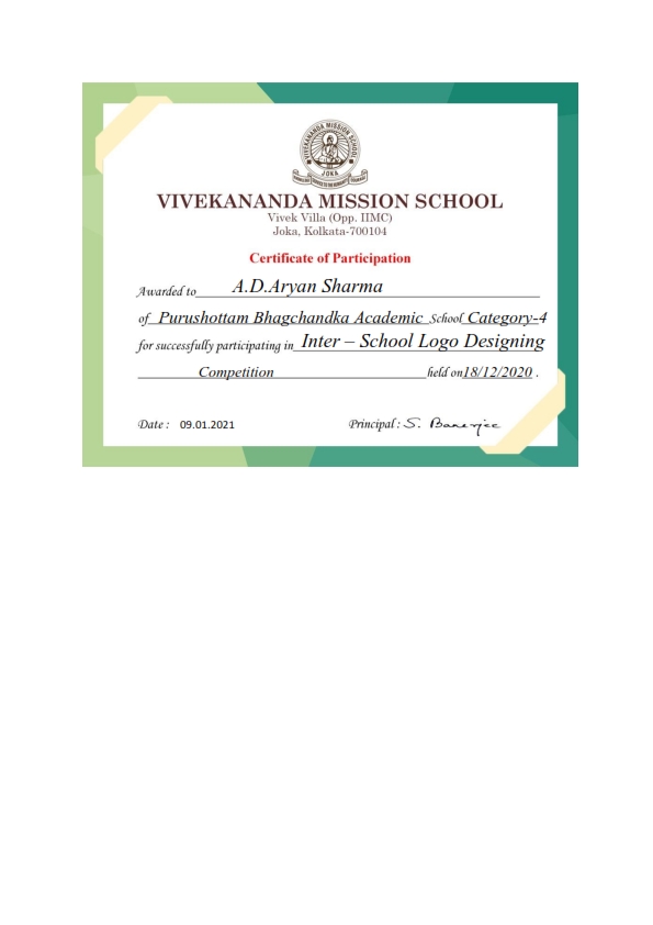 - A.D.Aryan Sharma, successfully participated in Inter- School Logo Designing Competition, held on 18.12.2020, receiving Certificate of Participation.