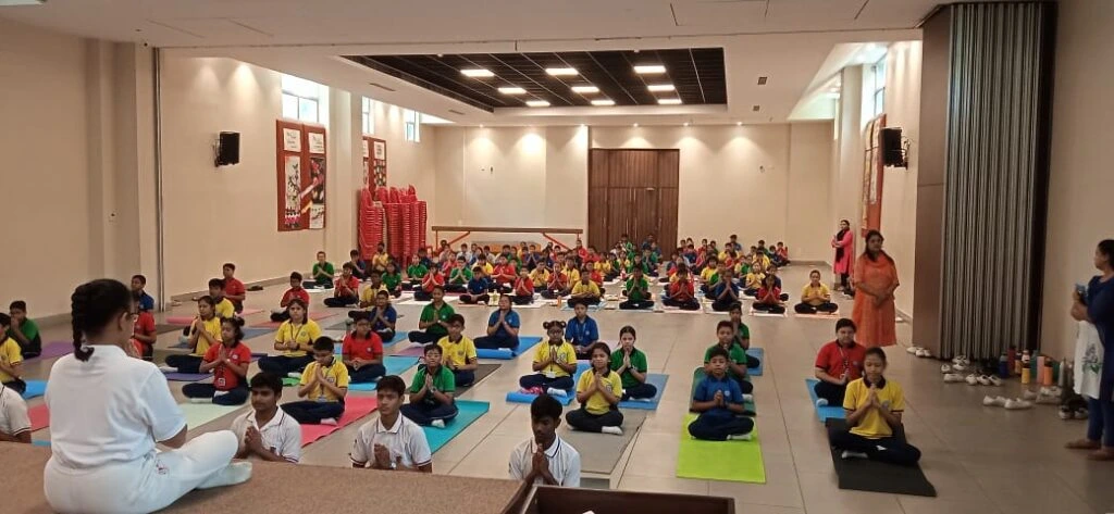 All the students from Classes III to XII participated in a yoga session in the school auditorium guided by a yoga practitioner. The session included yoga, comprising a series of poses and stretches with breathing techniques . It also focused on Yoga pledge, Surya Namaskar, Yoga formation and the different asanas.